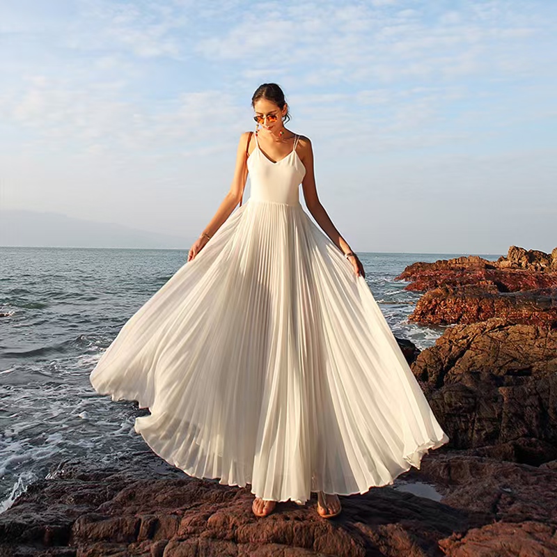 UPF50+防沙速干沙滩长裙- 特色:采用长效抗紫外线面料,兼具防沙、抗皱、速干属性,设计可拆卸飘带、隐形收纳口袋,适配海边度假与日常逛街双场景,推出多色系与大码款,覆盖不同身材与审美需求。