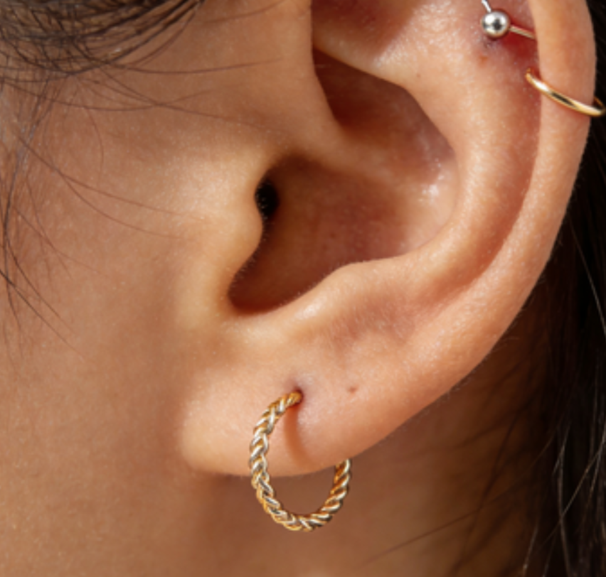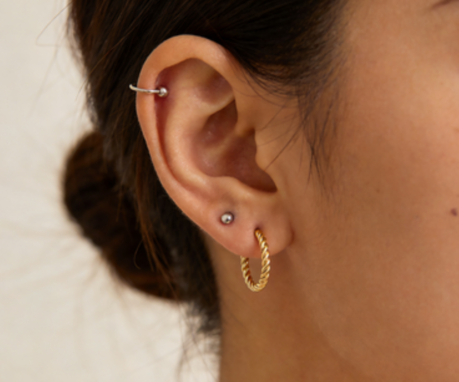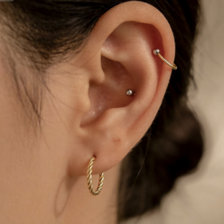 风靡ins的极细扭纹Hoop。直径仅1.2cm,非常精致小巧。金属丝经过细腻的螺旋扭纹处理,在光线下能折射出灵动多变的光泽,比普通光面hoop更具细节感。采用S925银针或14K包金针,防过敏。因其小巧的尺寸,不仅可作为基础耳垂钉,更是搭配耳骨、耳屏等多处耳洞的绝佳选择,轻松打造时髦的“星座穿孔”效果。