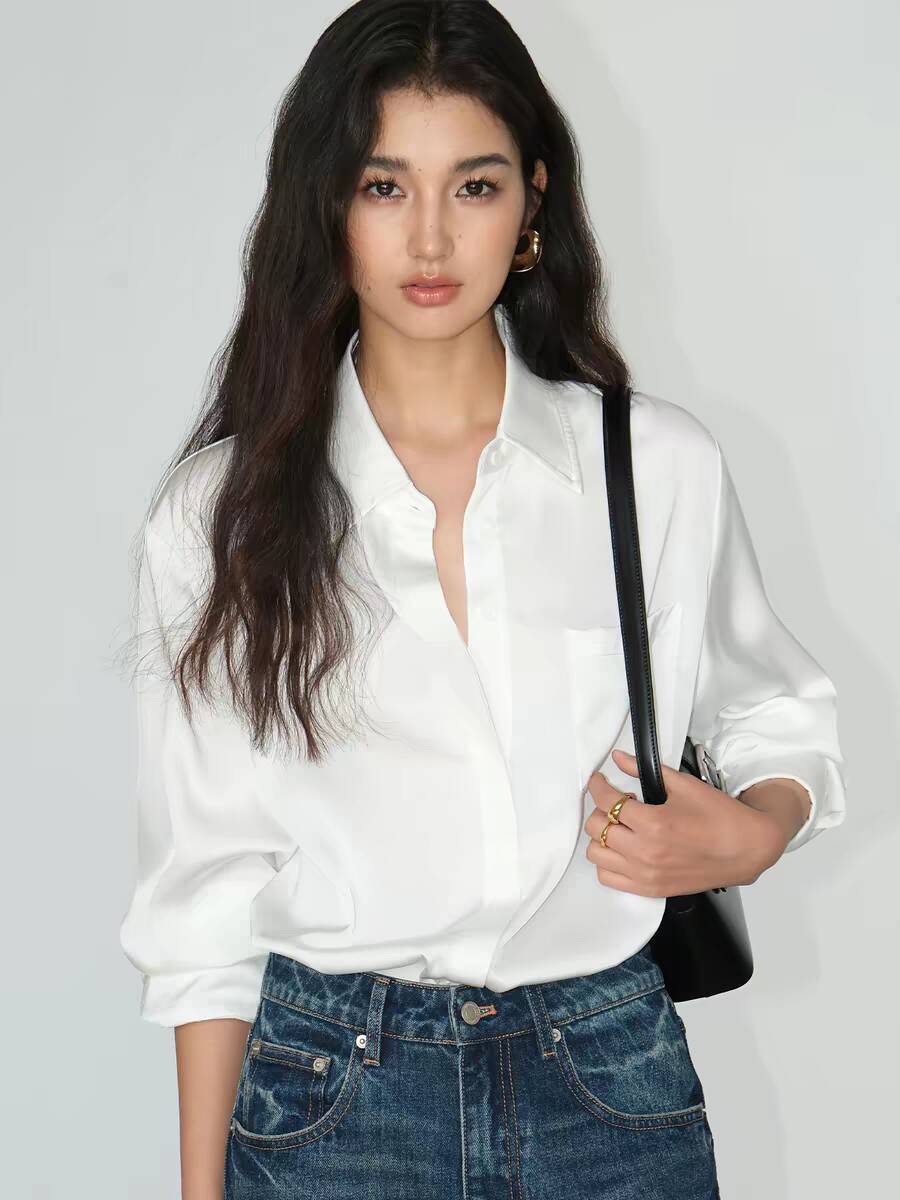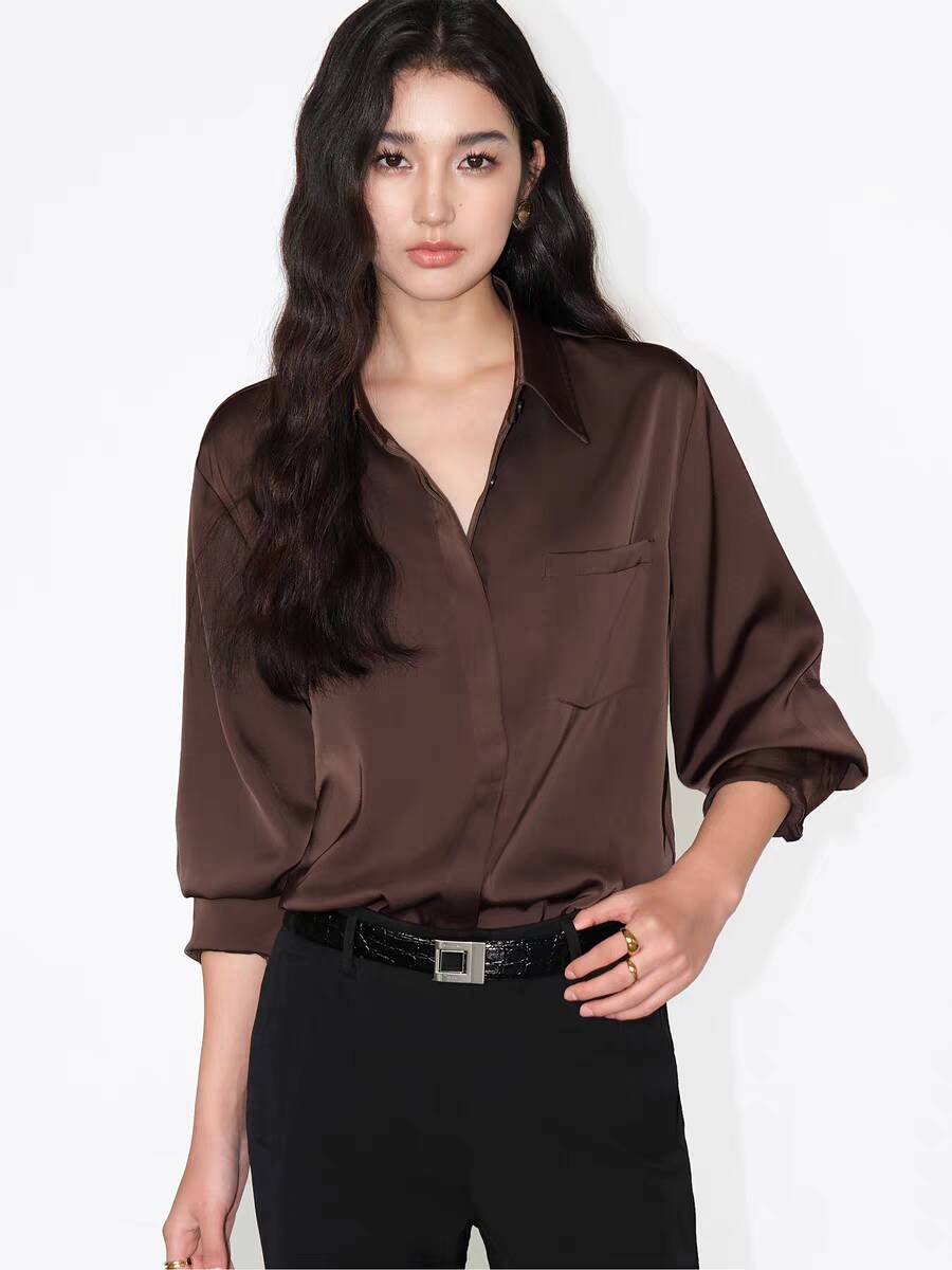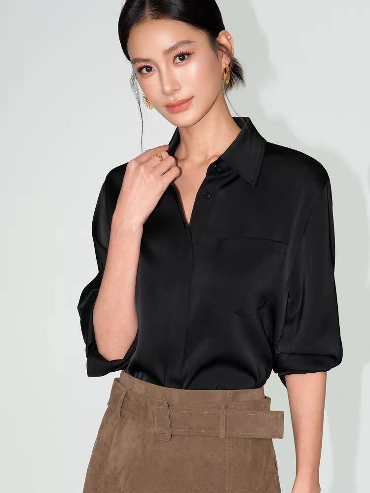 The Whisper Silk Satin Commuter Shirt is designed for casual workplace wear and is a versatile textured item in the wardrobe. Selected high-end satin mulberry silk fabric has a delicate soft light, a smooth touch and excellent drapability, showing a high-end feeling when worn. The classic lapel outlines the neck line, and the loose seven-quarter sleeve silhouette is very friendly to all body types, hiding flesh and showing thinness while adding a lazy and casual temperament. Three classic color systems of calm black, fresh white and gentle coffee can be paired with jeans to create a casual daily look, or combined with midi skirts and suit pants to fit office scenes, easily creating a high-end and minimalist dressing style.