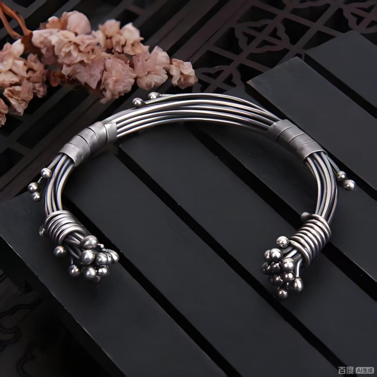 清迈匠人手工银镯 暹罗图腾纹 925 纯银可调圈口女饰